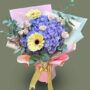 A single Hydrangea accompanied by sunny Carnations and Eucalyptus.