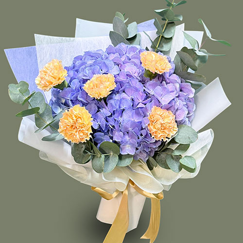 A single Hydrangea accompanied by sunny Carnations and Eucalyptus.